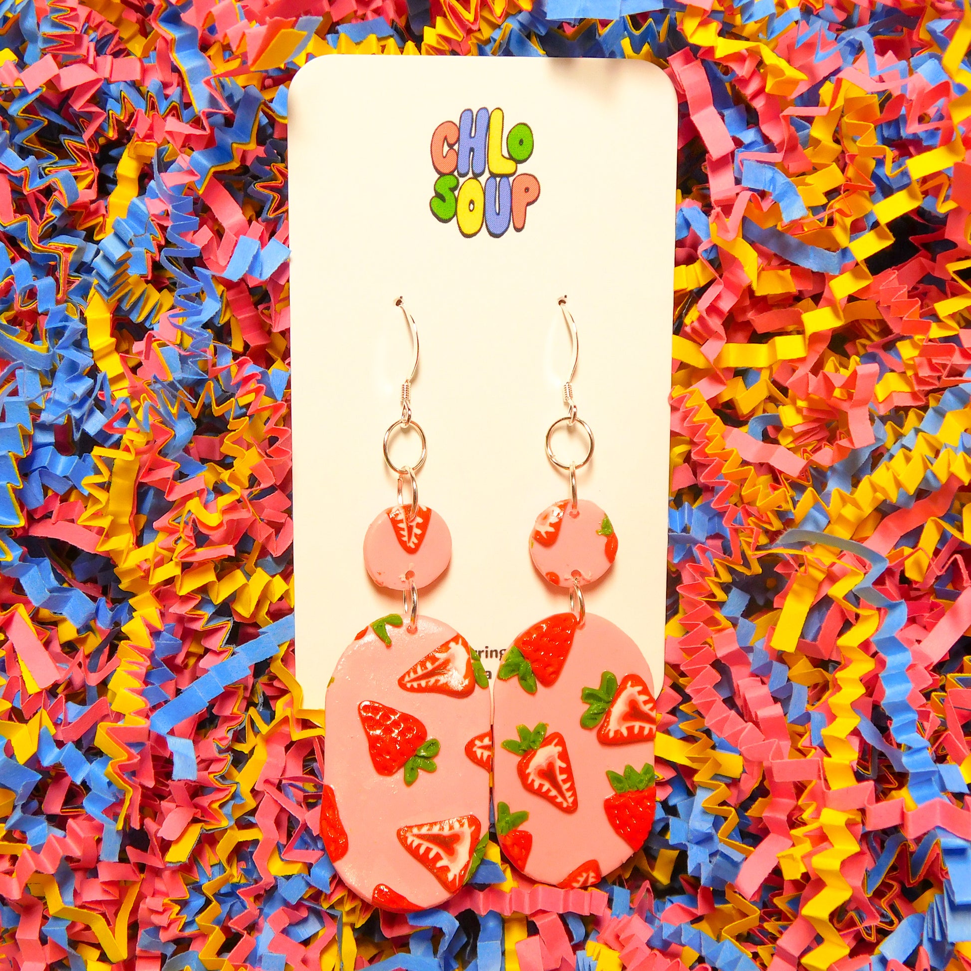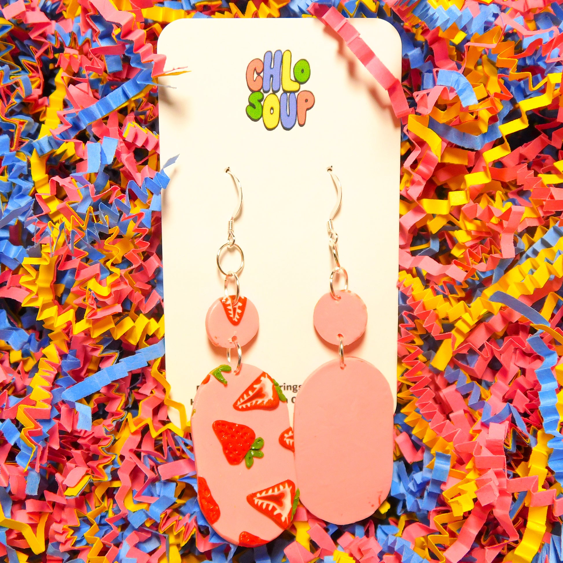 [Visual Description: Two pink capsule-shaped earrings covered in strawberries. The strawberry slices on the earrings show both the inside and outside of a strawberry, with little green leaves on top. Above the capsule shape is a small circle with the same pattern attached with jump rings to the ear wire. The earrings are on a white Chlosoup earring card. The background is blue, yellow and pink paper shred.]