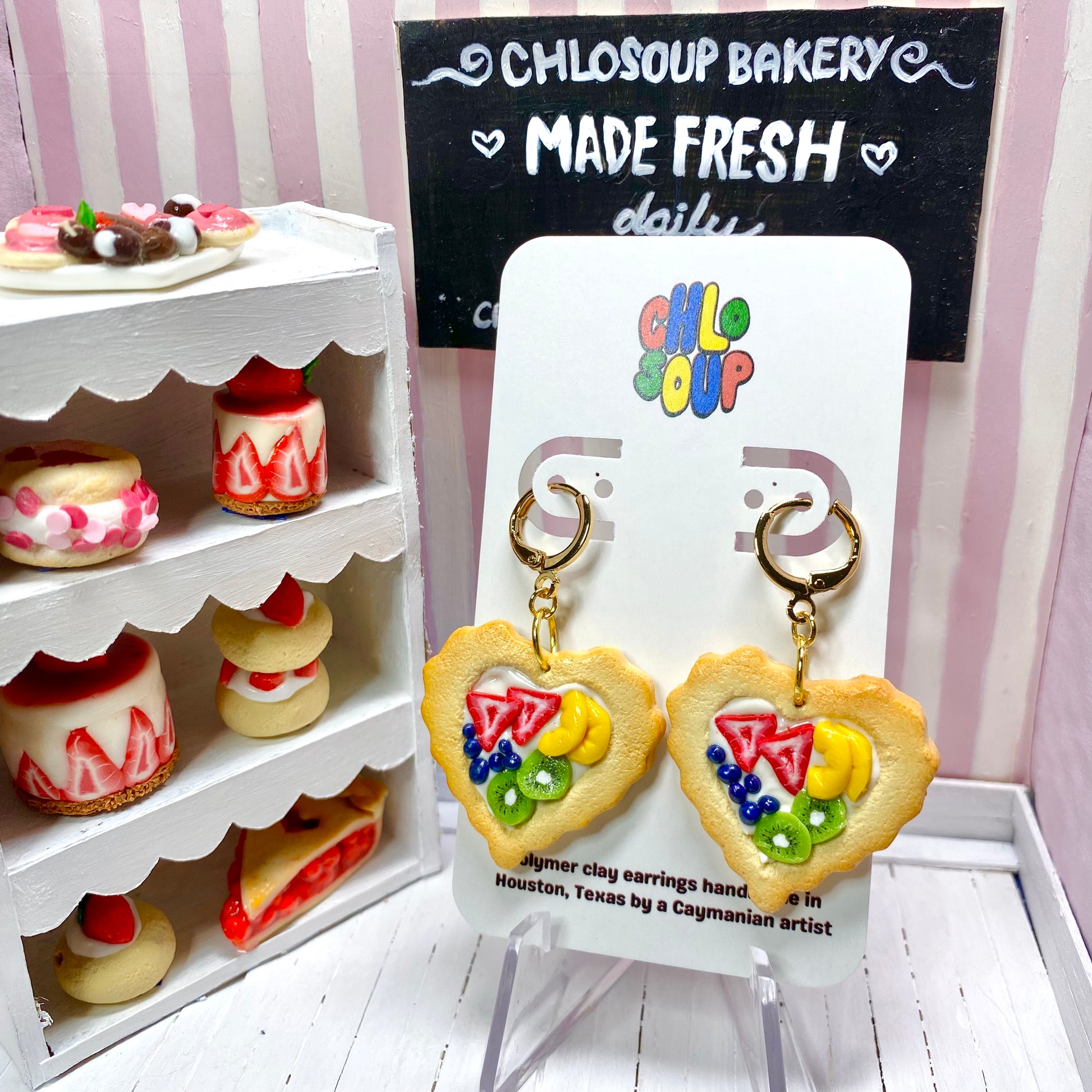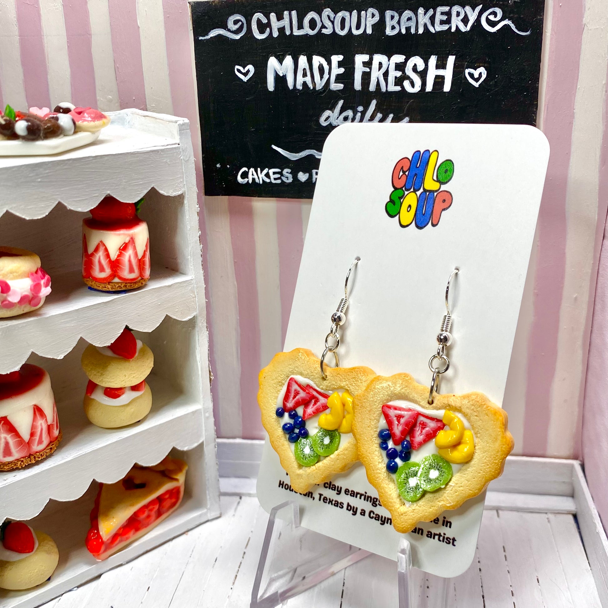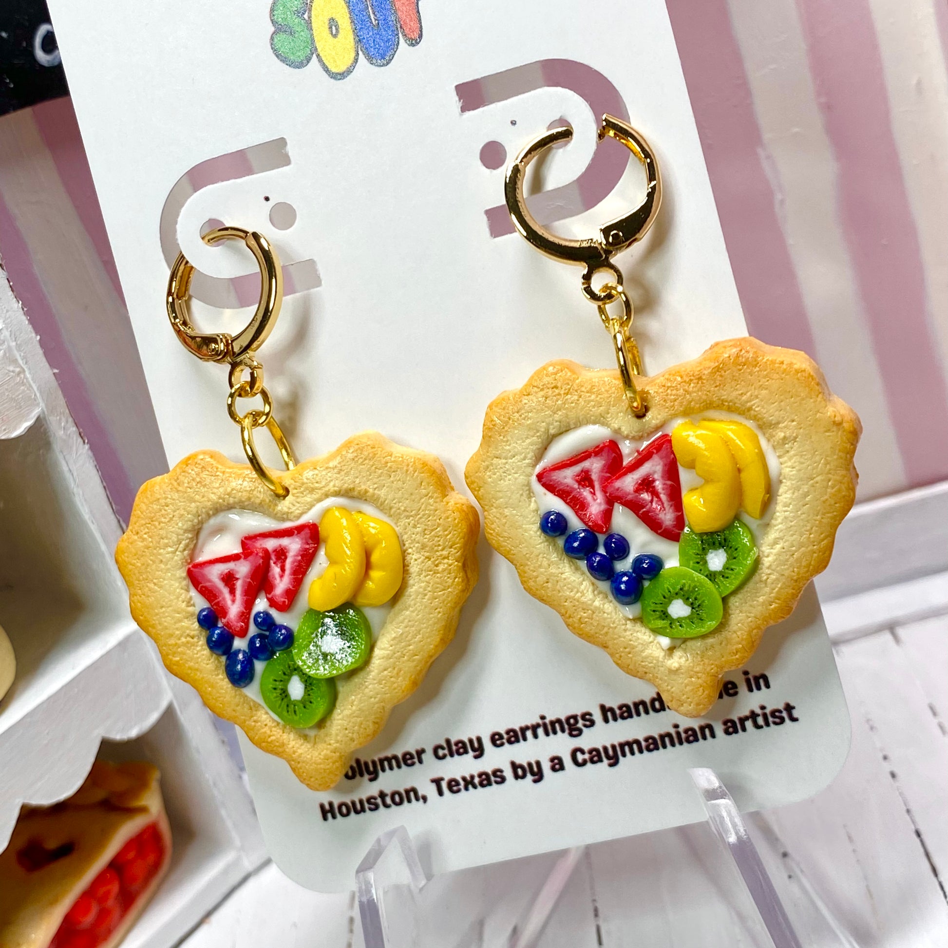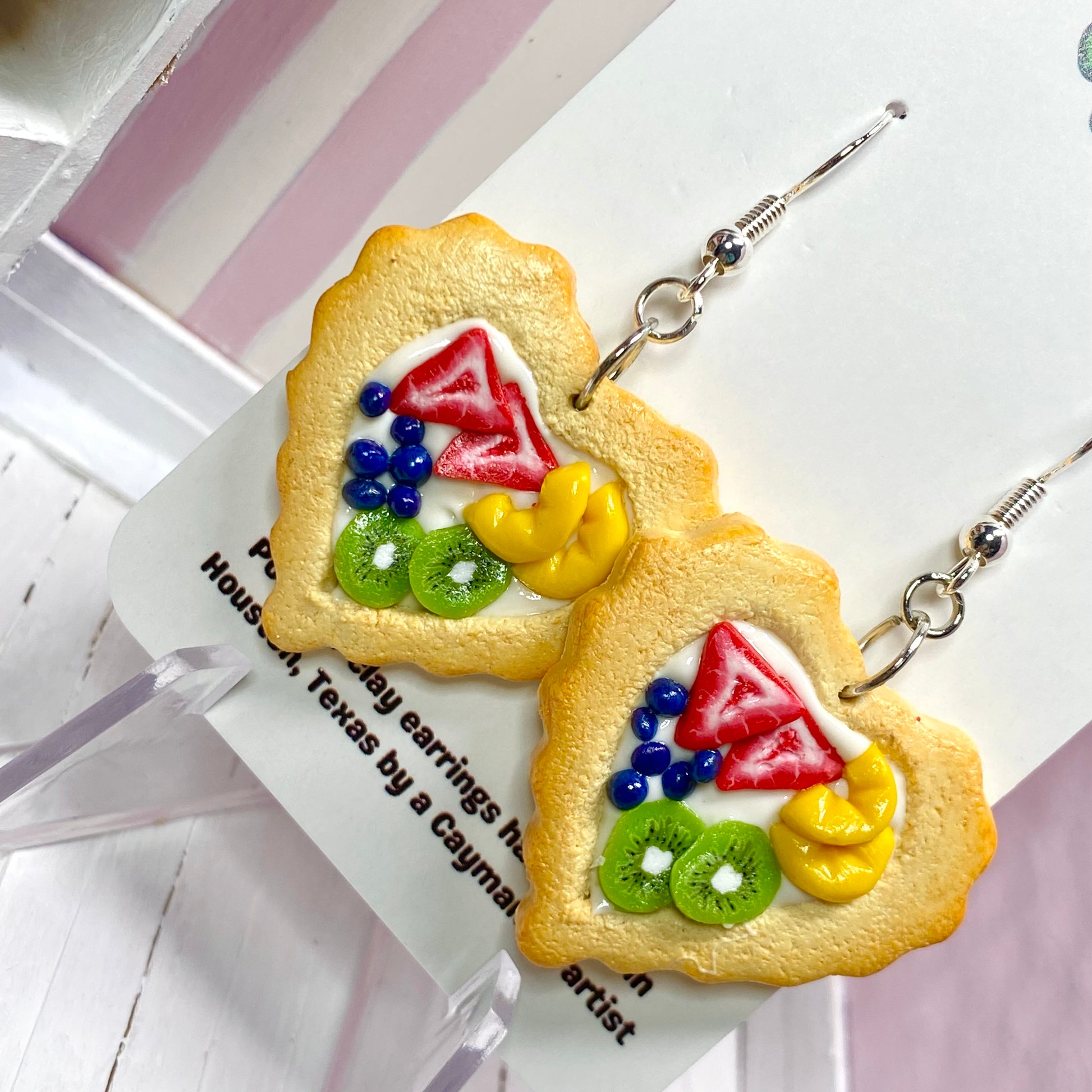 Handmade heart tart earrings! Each tart has a custard center with strawberries, blueberries, kiwis, and peaches on top! These tarts are plain and untextured on the back.