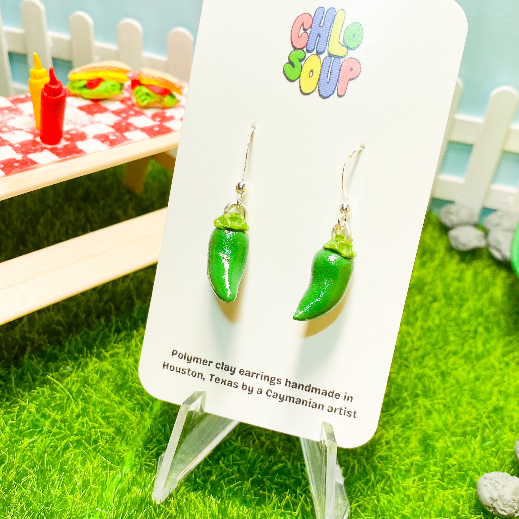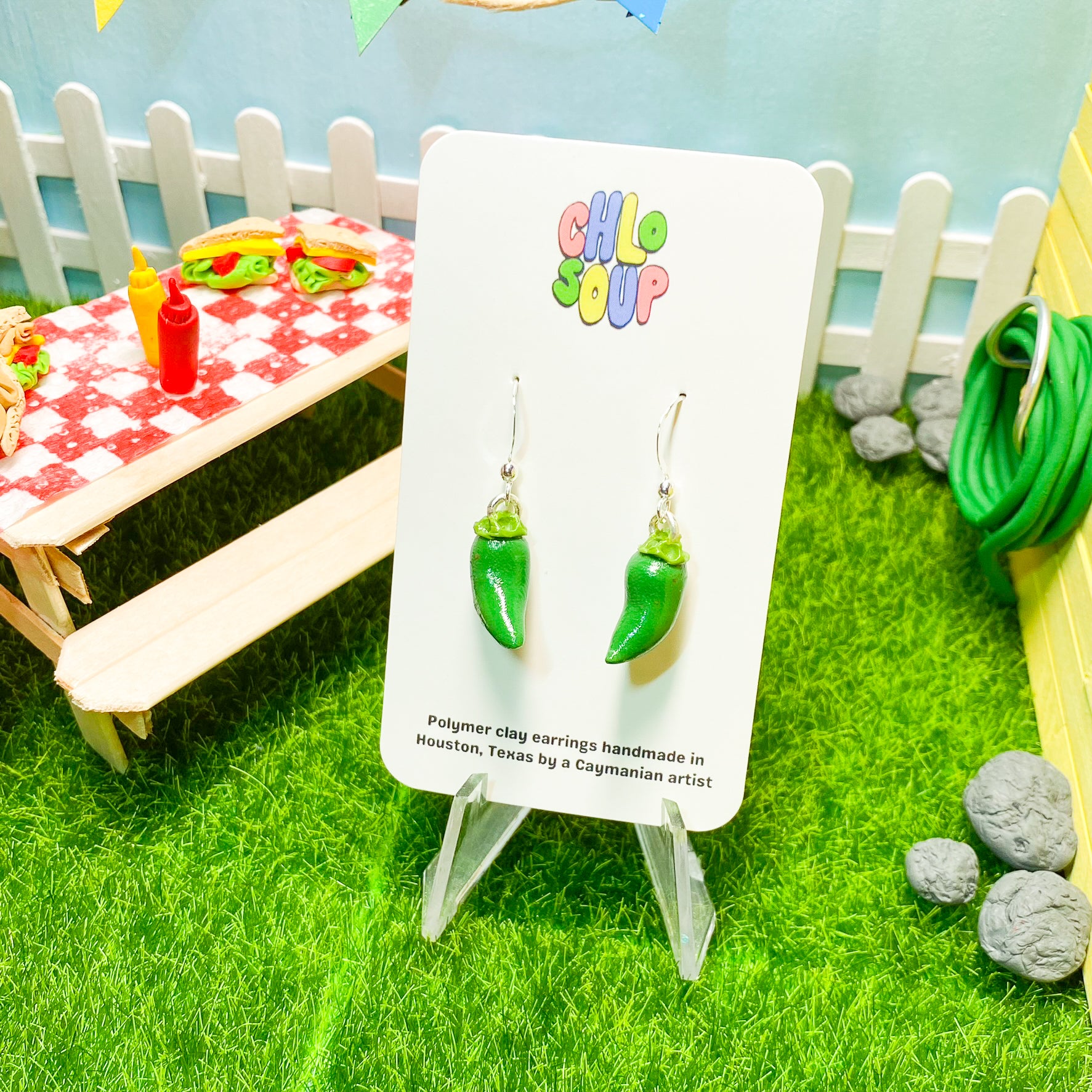 [Visual Description: Two extra small miniature green jalapeño earrings. The earrings are on a white Chlosoup card. The background is a backyard cookout scene. There is fake grass, a picnic table with a red and white checker print tablecloth, topped with sandwiches and bottles of ketchup and mustard. There is a white picket fence and a blue sky, triangle flags on a line in rainbow colors, and off to the right side is a yellow wall with a garden hose.]