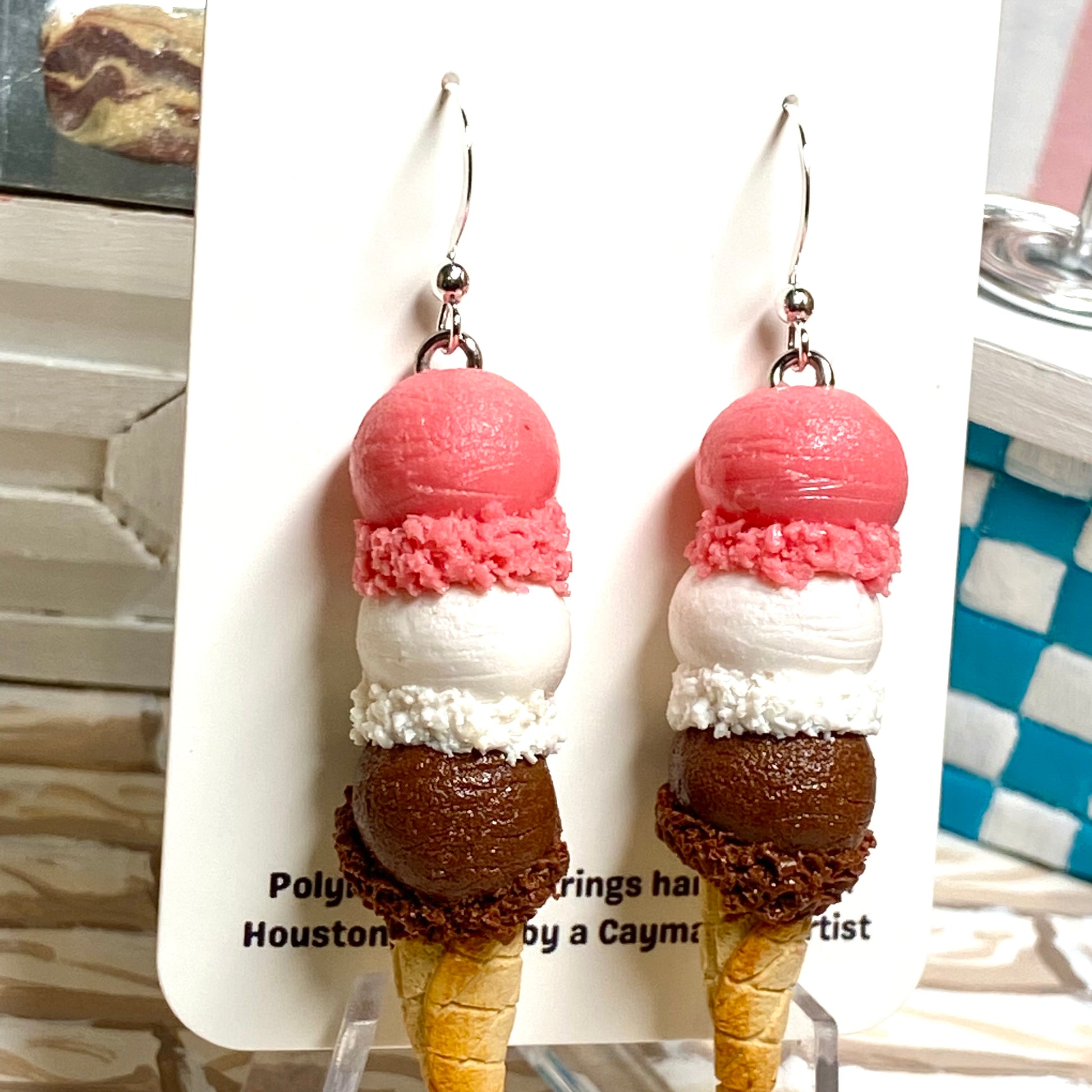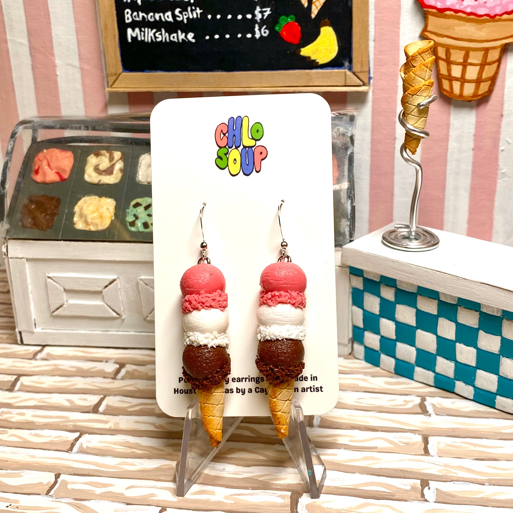 [Visual Description: Two miniature Neapolitan ice cream earrings. The bottom scoop is chocolate, the middle vanilla, and the top strawberry. The earrings are on a white Chlosoup earring card. The background is an ice cream shop, with a cooler full of ice cream, and a small counter with blue and white checkered tiles, with a stack of cones on top. The walls are pink and white striped with a menu and sign reading 'Chlosoup Scoops' on the wall. The floor is light wood planks.]