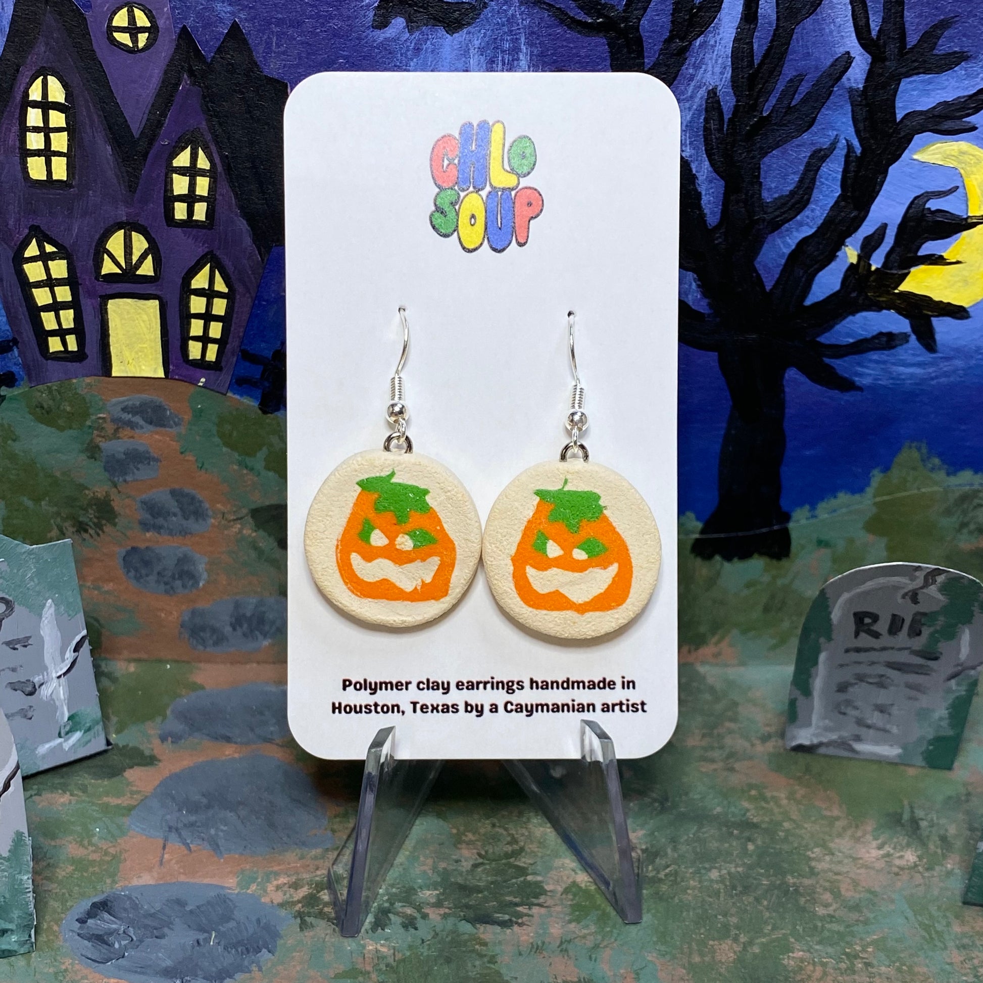 [Visual Description: Two miniature Pillsbury inspired sugar cookies. The cookies are flat and have a pumpkin in the middle. The pumpkin has 2 green and white eyes and a white pointy teeth mouth in a smile. The earrings are on a white Chlosoup earring card. The background is a light wood surface.]
